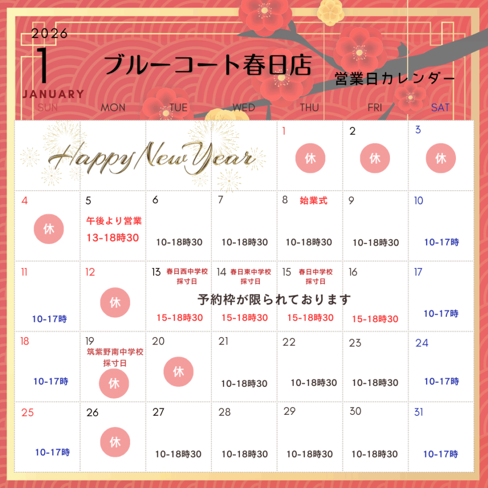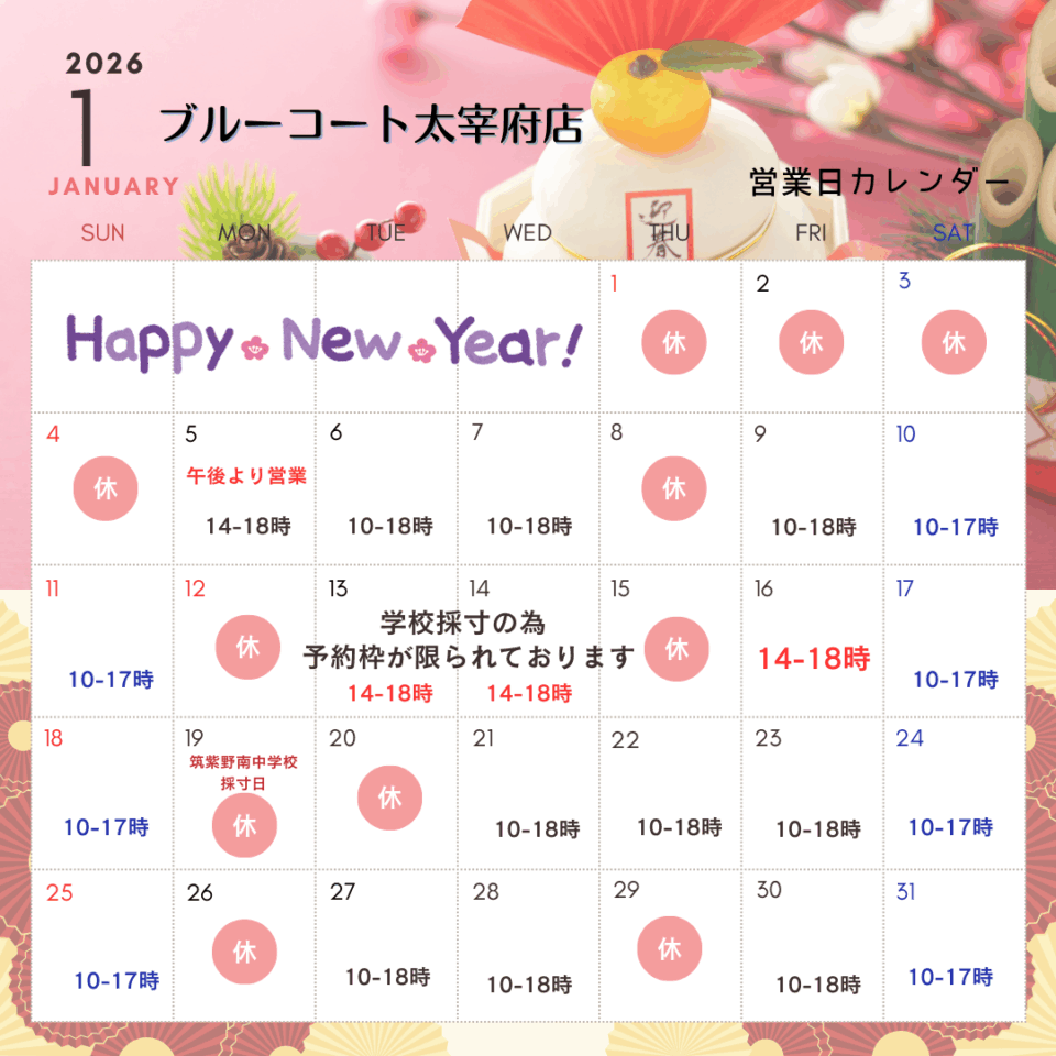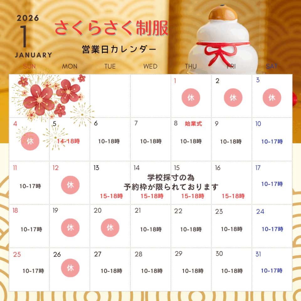 学生服ブルーコートとさくら咲く制服の1月営業日・営業時間カレンダーです。