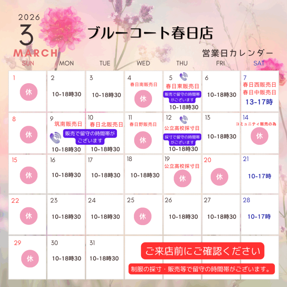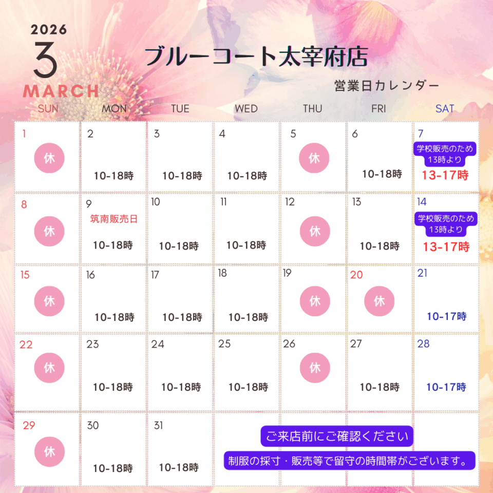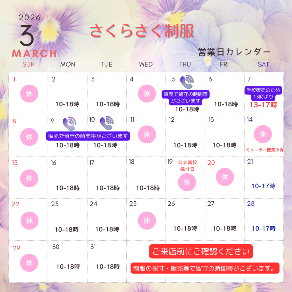 下記のとおり3月営業日と営業時間をお知らせいたします。